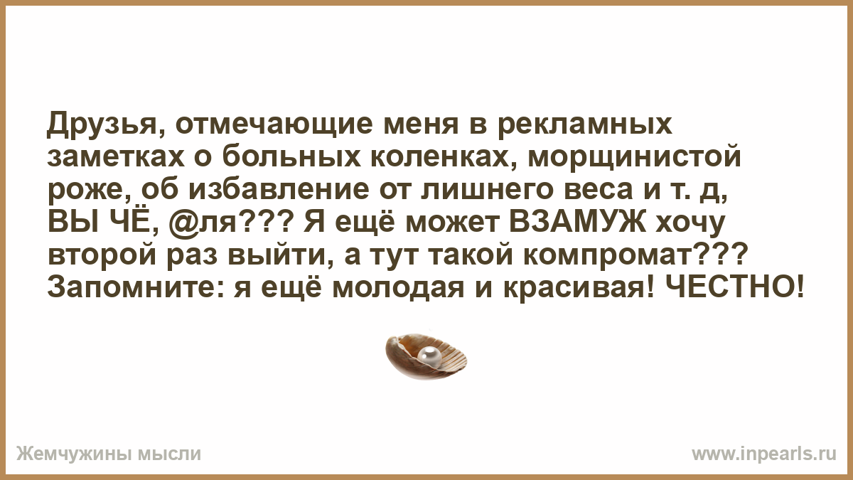 Друзья, отмечающие меня в рекламных заметках о больных коленках, морщинистой роже, об избавление от лишнего веса и т. д, ВЫ ЧЁ, @ля??? Я ещё может ВЗАМУЖ хочу второй раз выйти, а тут такой компромат??? Запомните: я ещё молодая и красивая! ЧЕСТНО!
