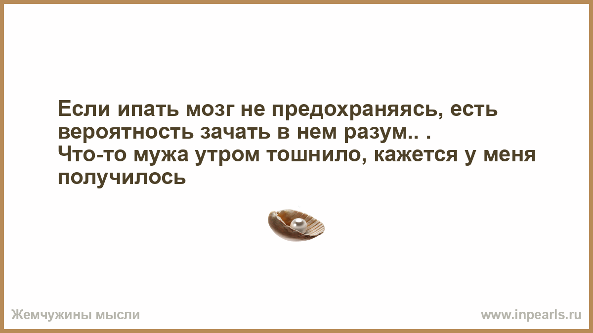 Если ипать мозг не предохраняясь, есть вероятность зачать в нем разум.. . Что-то мужа утром тошнило, кажется у меня получилось