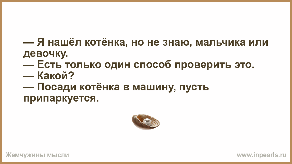 — Я нашёл котёнка, но не знаю, мальчика или девочку. — Есть только один способ проверить это. — Какой? — Посади котёнка в машину, пусть припаркуется.