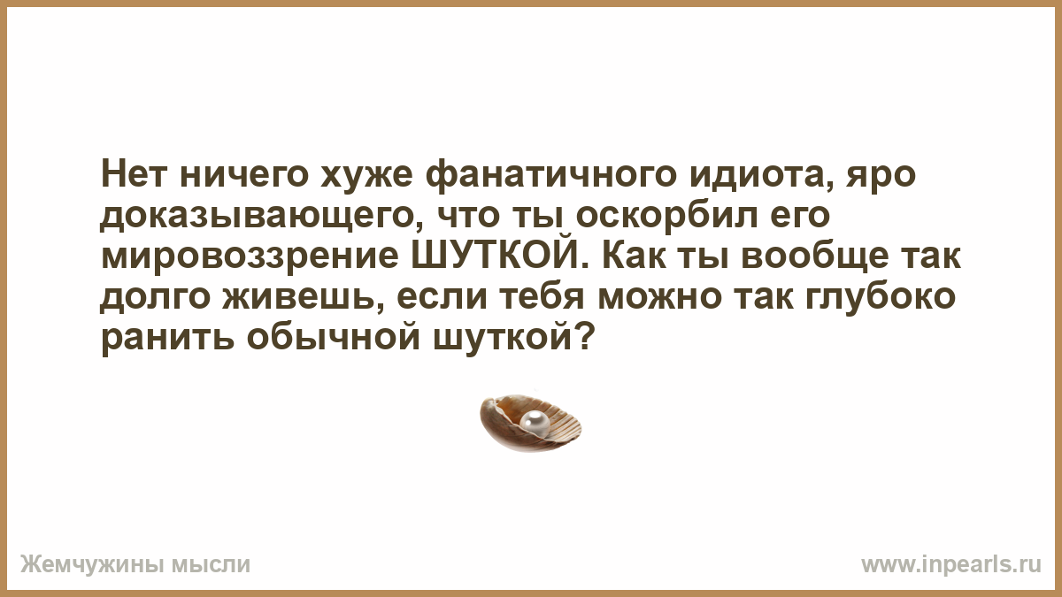 Нет ничего хуже фанатичного идиота, яро доказывающего, что ты оскорбил его мировоззрение ШУТКОЙ. Как ты вообще так долго живешь, если тебя можно так глубоко ранить обычной шуткой?