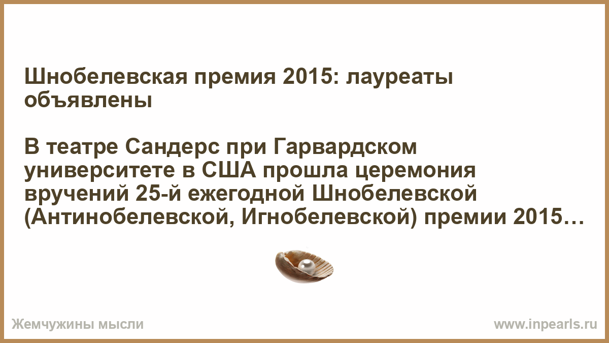 В театре Сандерс при Гарвардском университете в США прошла церемония вручений 25-й ежегодной Шнобелевской (Антинобелевской, Игнобелевской) премии 2015 года, присуждаемой за научные достижения, «которые сначала вызывают смех, а затем заставляют задуматься». Перед вами — список лауреатов и их самых нелепых и смешных достижений…