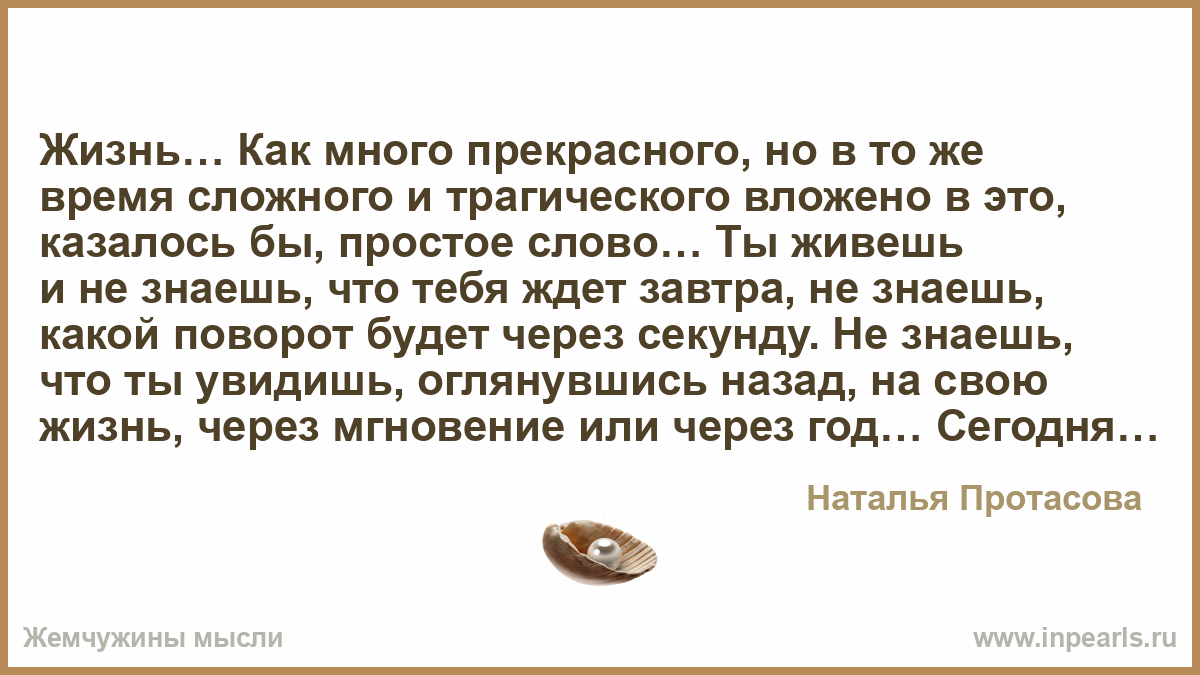 Жизнь… Как много прекрасного, но в то же время сложного и трагического вложено в это, казалось бы, простое слово… Ты живешь и не знаешь, что тебя ждет завтра, не знаешь, какой поворот будет через секунду. Не знаешь, что ты увидишь, оглянувшись назад, на свою жизнь, через мгновение или через год… Сегодня тебе видится вся твоя жизнь как сплошной праздник, а завтра она покажется серой и унылой. Жизнь это бесценный подарок, которым нужно дорожить, каждую минуту, каждую секунду…, так как жизнь — это самое загадочное чудо, и волшебник, который творит это чудо, это волшебство — ты…