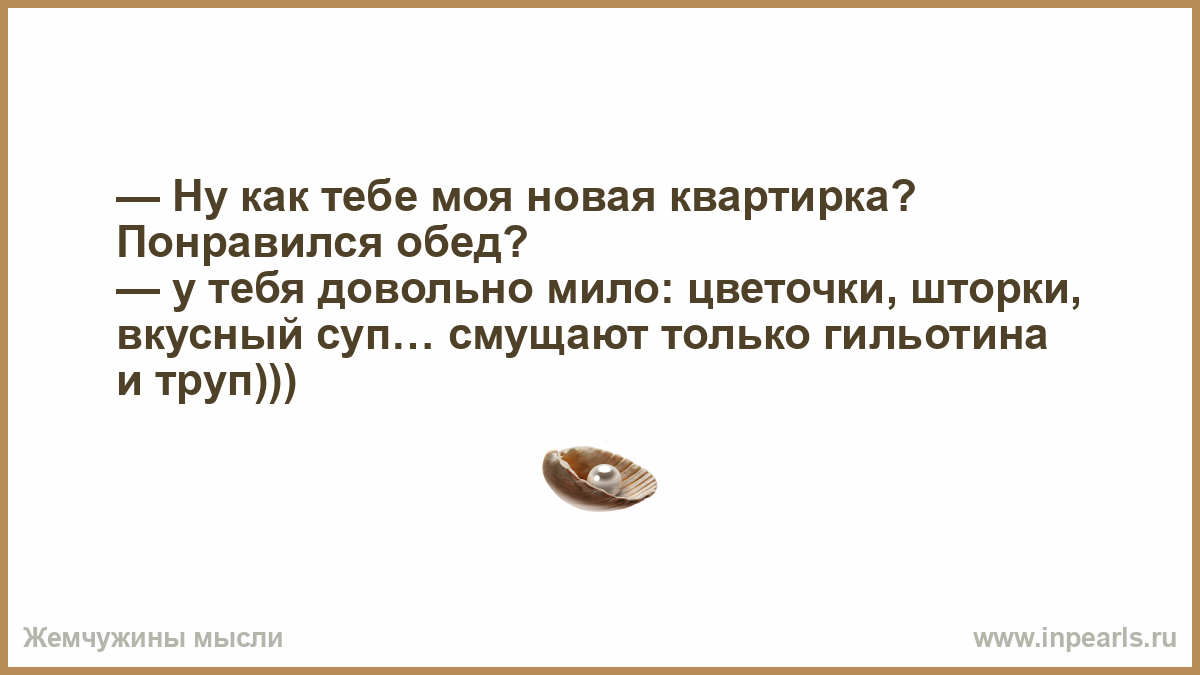 — Ну как тебе моя новая квартирка? Понравился обед? — у тебя довольно мило: цветочки, шторки, вкусный суп… смущают только гильотина и труп)))