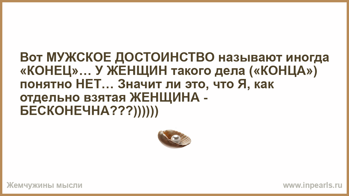 Вот МУЖСКОЕ ДОСТОИНСТВО называют иногда «КОНЕЦ»… У ЖЕНЩИН такого дела («КОНЦА») понятно НЕТ… Значит ли это, что Я, как отдельно взятая ЖЕНЩИНА - БЕСКОНЕЧНА???))))))