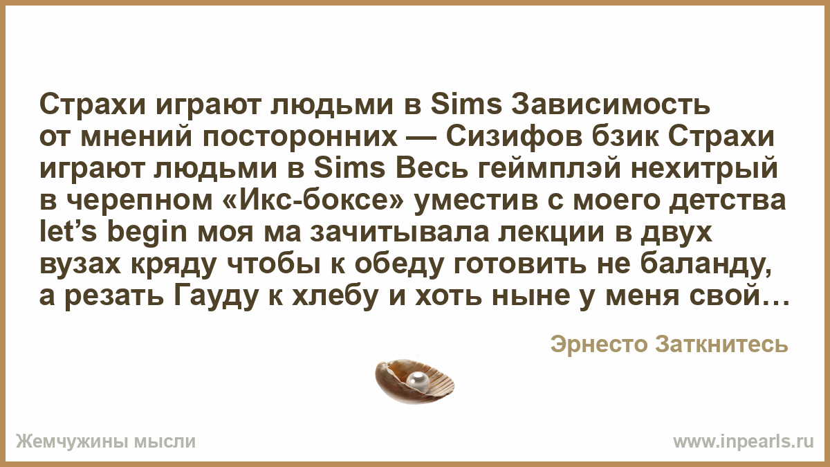 Страхи играют людьми в Sims Зависимость от мнений посторонних — Сизифов бзик Страхи играют людьми в Sims Весь геймплэй нехитрый в черепном «Икс-боксе» уместив с моего детства let’s begin моя ма зачитывала лекции в двух вузах кряду чтобы к обеду готовить не баланду, а резать Гауду к хлебу и хоть ныне у меня свой лекторий «фил соу лонли» как Фредди Меркурий внутри клокочет Кунг Фьюри Эрнесто телесно и устно ускорив Из угловатости недвижимости новаторский мой вышел стиль здесь и постиг как вокабуляра кульбиты биту обрести Каждый шаг — это шанс Воспарить и вровень стать этим 2-значным этажам Чемодана кожа пахнет ночью путешествовательной на голове не нужны ни бандана «Крипс», ни венчик тернов Нутро не требует в качестве интро в стиле Венички штоф Надо только намотать на руку шнур микро, как веретено Дома — рафинад Графика на средних настройках: марта вина (*Eva!*) Домов рафинад Мне бросить творчество? Скорей, в какой-то выйдет Андорра финал [Hook: Logonaut] Смешай мне, бармен, прилежания и похуизма Дорог весна, да дороговизна Смотреть на ваши будни — смотреть договорняк Я под обстрелом, многослойна благо броня устало потираю темя, как танцор тектоника не стоит пфеннинга внутри башки полемика всё равно собой никак доволен не станусь; с колонок ебашит Иоганн Штраус за тайною тайну мотаю на ус Откуда-то свыше прочерчен на пути пунктир блужданий Несётся по кругу Земной шар, невесомости жалом ужален Если есть, что сказать, карауль рупор Завтра ненадёжно, как валюта «Рубль» Не сдерживай вопль Дни всегда на убыль, Но помни: робы из грубой ткани в гардеробе у правдоруба Если плод червив в ладони Евы дочери Побег из Эдема кончится пикником у обочины И после — для неё ты сторонний чел Да будут все твои попутки гоночны Не каждый рискнёт выслеживать путь к неуловимой добыче Кому-то тащить домой тушу убитую первым же выстрелом будет привычней, Но чем цель несбыточней Тем меньше пронырливых выскочек Тем филиграннее навыки Тем ходы от балды точней, Но страхи играют людьми в Sims Весь геймплей нехитрый в черепном «Икс-боксе» уместив **********************************************************************************************************************************Если Земфира лет так на 10