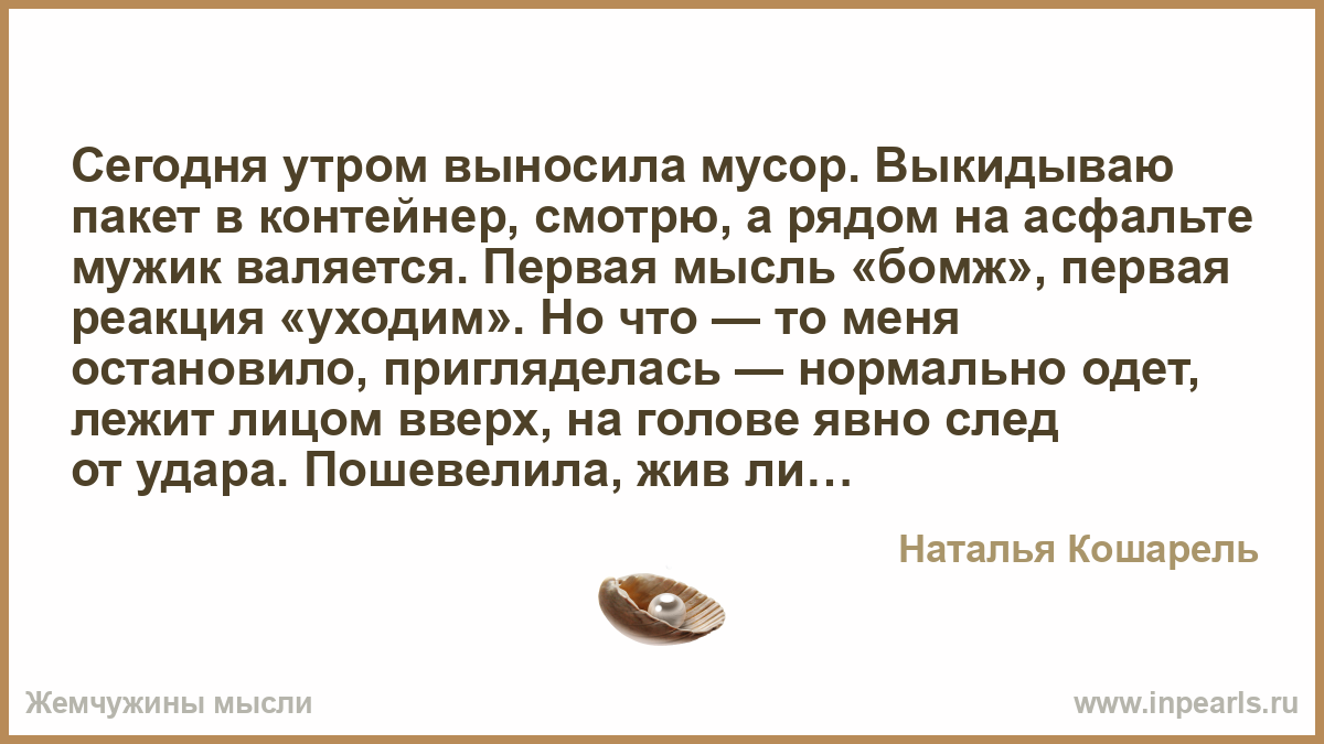 Cегодня утром выносила мусор. Выкидываю пакет в контейнер, смотрю, а рядом на асфальте мужик валяется. Первая мысль «бомж», первая реакция «уходим». Но что — то меня остановило, пригляделась — нормально одет, лежит лицом вверх, на голове явно след от удара. Пошевелила, жив ли?
