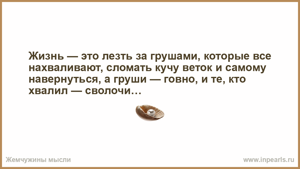 Жизнь — это лезть за грушами, которые все нахваливают, сломать кучу веток и самому навернуться, а груши — говно, и те, кто хвалил — сволочи…