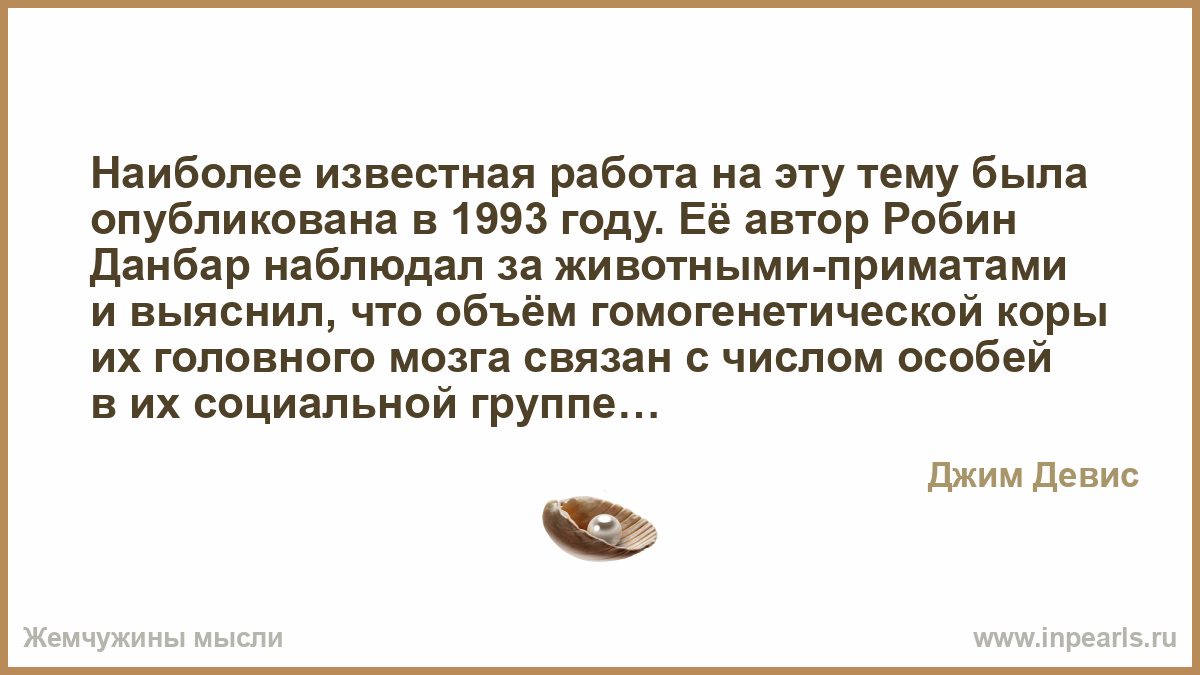 Наиболее известная работа на эту тему была опубликована в 1993 году. Её автор Робин Данбар наблюдал за животными-приматами и выяснил, что объём гомогенетической коры их головного мозга связан с числом особей в их социальной группе.