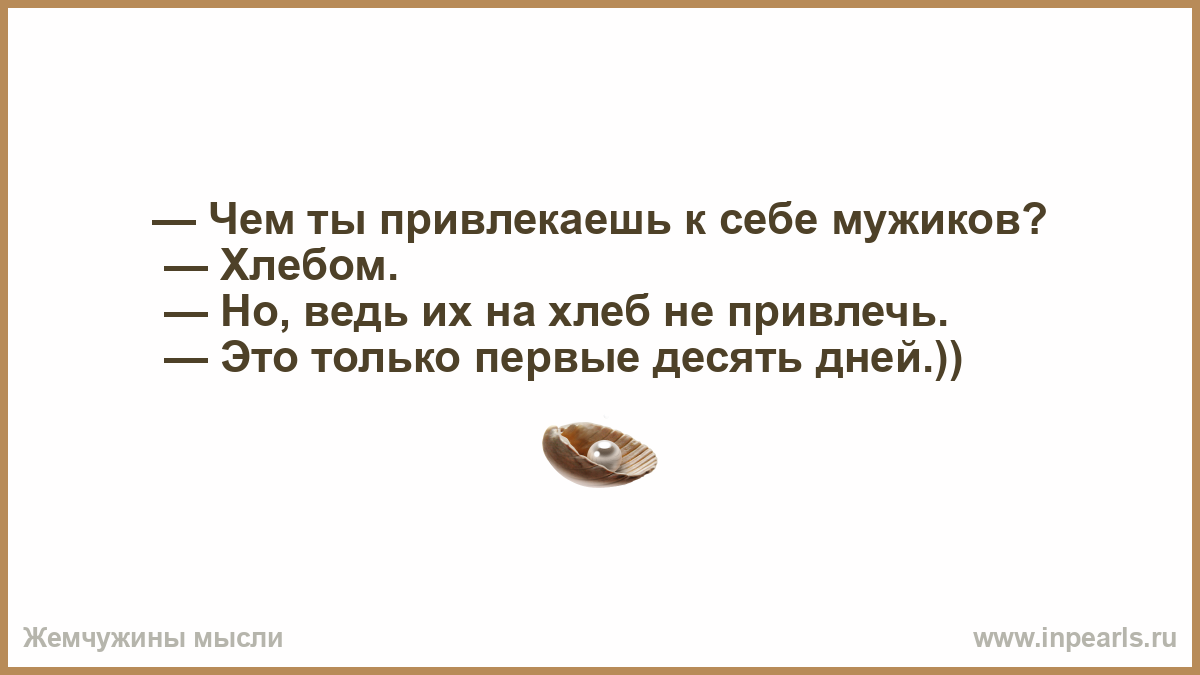 — Чем ты привлекаешь к себе мужиков? — Хлебом. — Но, ведь их на хлеб не привлечь. — Это только первые десять дней.))