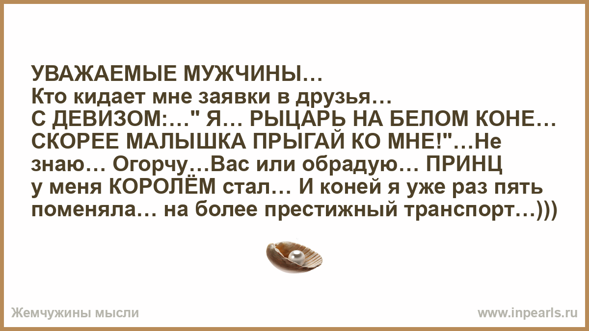 УВАЖАЕМЫЕ МУЖЧИНЫ… Кто кидает мне заявки в друзья… С ДЕВИЗОМ:…" Я… РЫЦАРЬ НА БЕЛОМ КОНЕ… СКОРЕЕ МАЛЫШКА ПРЫГАЙ КО МНЕ!"…Не знаю… Огорчу…Вас или обрадую… ПРИНЦ у меня КОРОЛЁМ стал… И коней я уже раз пять поменяла… на более престижный транспорт…)))