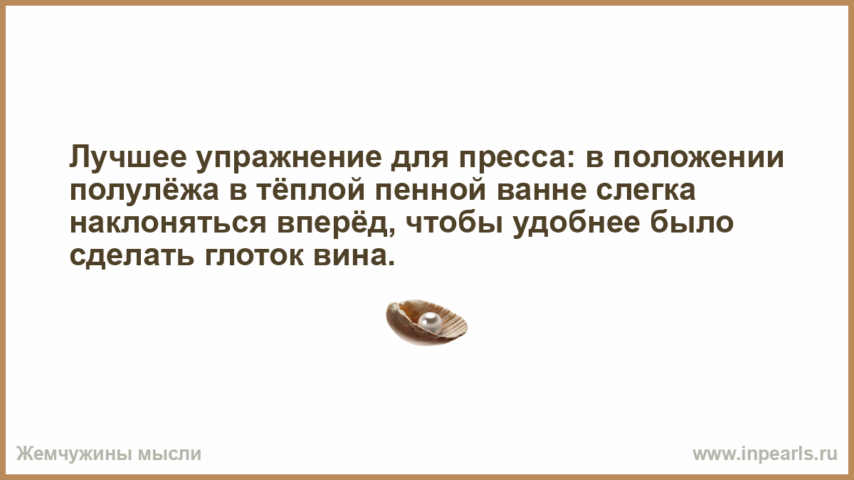 Лучшее упражнение для пресса: в положении полулёжа в тёплой пенной ванне слегка наклоняться вперёд, чтобы удобнее было сделать глоток вина.
