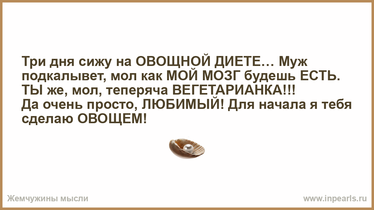 Три дня сижу на ОВОЩНОЙ ДИЕТЕ… Муж подкалывет, мол как МОЙ МОЗГ будешь ЕСТЬ. ТЫ же, мол, теперяча ВЕГЕТАРИАНКА!!! Да очень просто, ЛЮБИМЫЙ! Для начала я тебя сделаю ОВОЩЕМ!