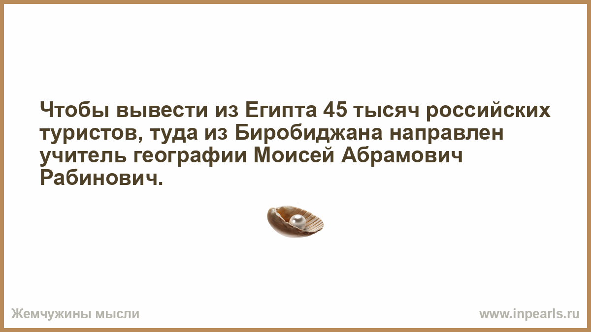 Чтобы вывести из Египта 45 тысяч российских туристов, туда из Биробиджана направлен учитель географии Моисей Абрамович Рабинович.