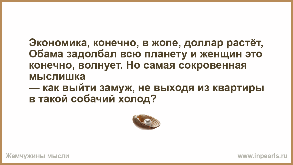«…Женщина должна быть кроткой и иногда бегать среди березок, а ее надо догонять и щекотать усами. А потом сразу снова кроткая и должна рубить в день по машине дров, и, подоткнув косу, самостоятельно резать порося. И ни одного лишнего слова. Только самые необходимые: «Барин, ужинать подано», «Не желаете ли отдохнуть?», «А водочки?», «Имеется ли настроеньице для утех?»