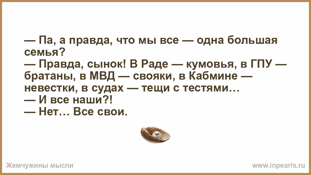 — Правда, сынок! В Раде — кумовья, в ГПУ — братаны, в МВД — свояки, в Кабмине — невестки, в судах — тещи с тестями…