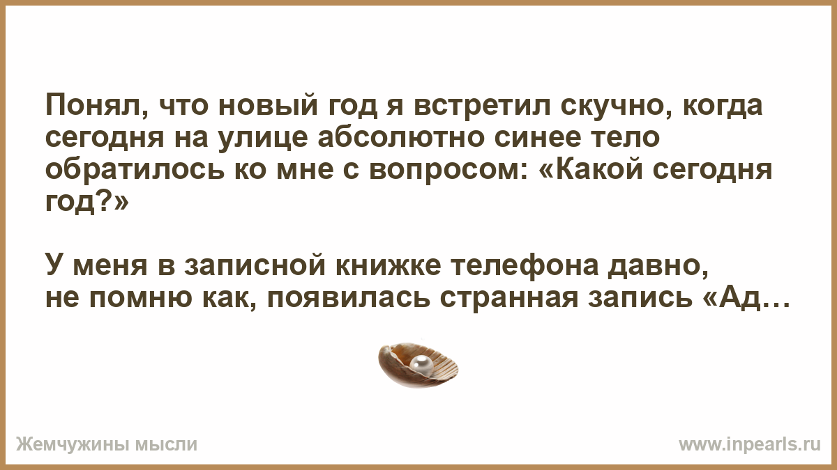Понял, что новый год я встретил скучно, когда сегодня на улице абсолютно синее тело обратилось ко мне с вопросом: «Какой сегодня год?»