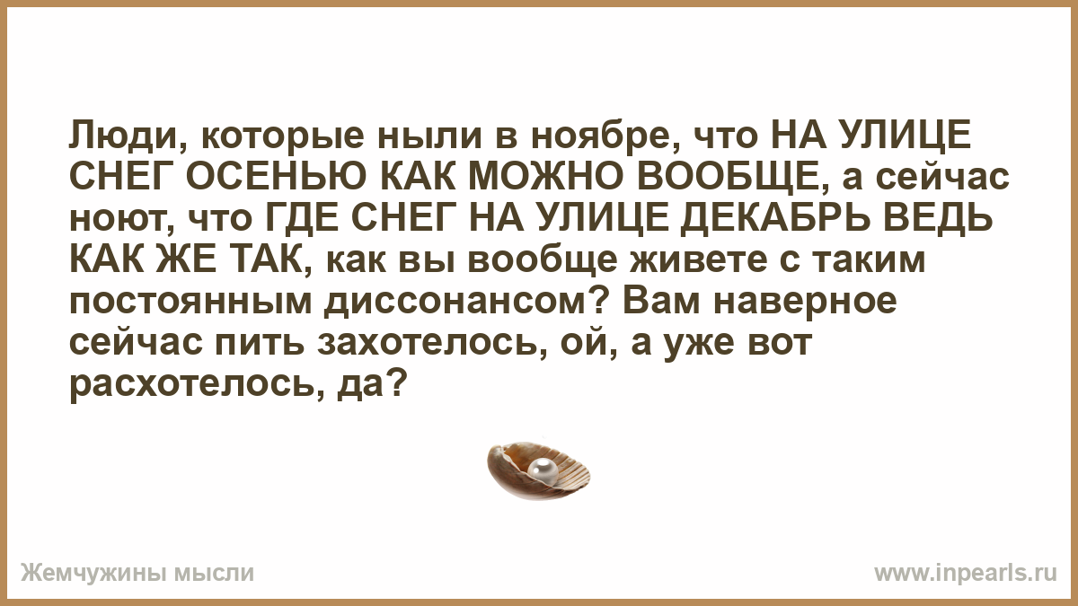 Люди, которые ныли в ноябре, что НА УЛИЦЕ СНЕГ ОСЕНЬЮ КАК МОЖНО ВООБЩЕ, а сейчас ноют, что ГДЕ СНЕГ НА УЛИЦЕ ДЕКАБРЬ ВЕДЬ КАК ЖЕ ТАК, как вы вообще живете с таким постоянным диссонансом? Вам наверное сейчас пить захотелось, ой, а уже вот расхотелось, да?
