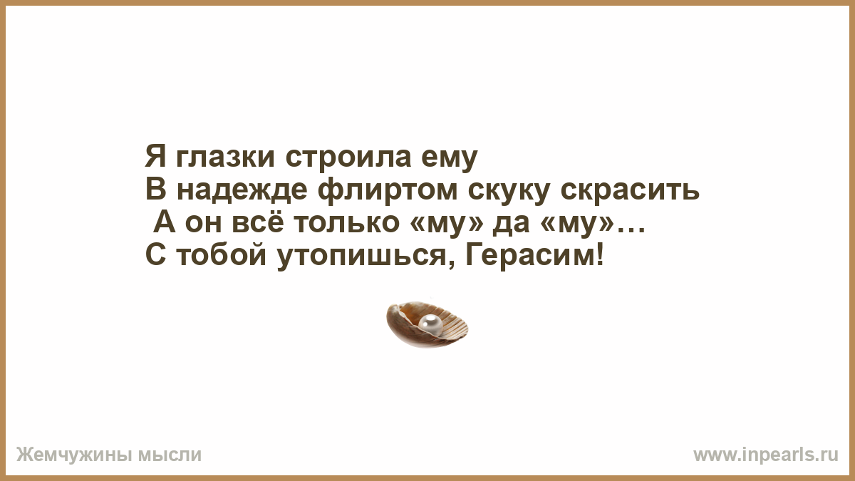 Я глазки строила ему В надежде флиртом скуку скрасить А он всё только «му» да «му»… С тобой утопишься, Герасим!