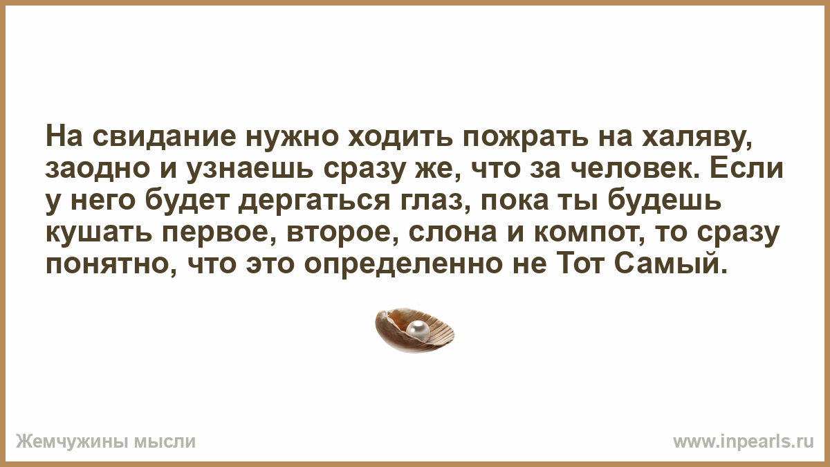 На свидание нужно ходить пожрать на халяву, заодно и узнаешь сразу же, что за человек. Если у него будет дергаться глаз, пока ты будешь кушать первое, второе, слона и компот, то сразу понятно, что это определенно не Тот Самый.