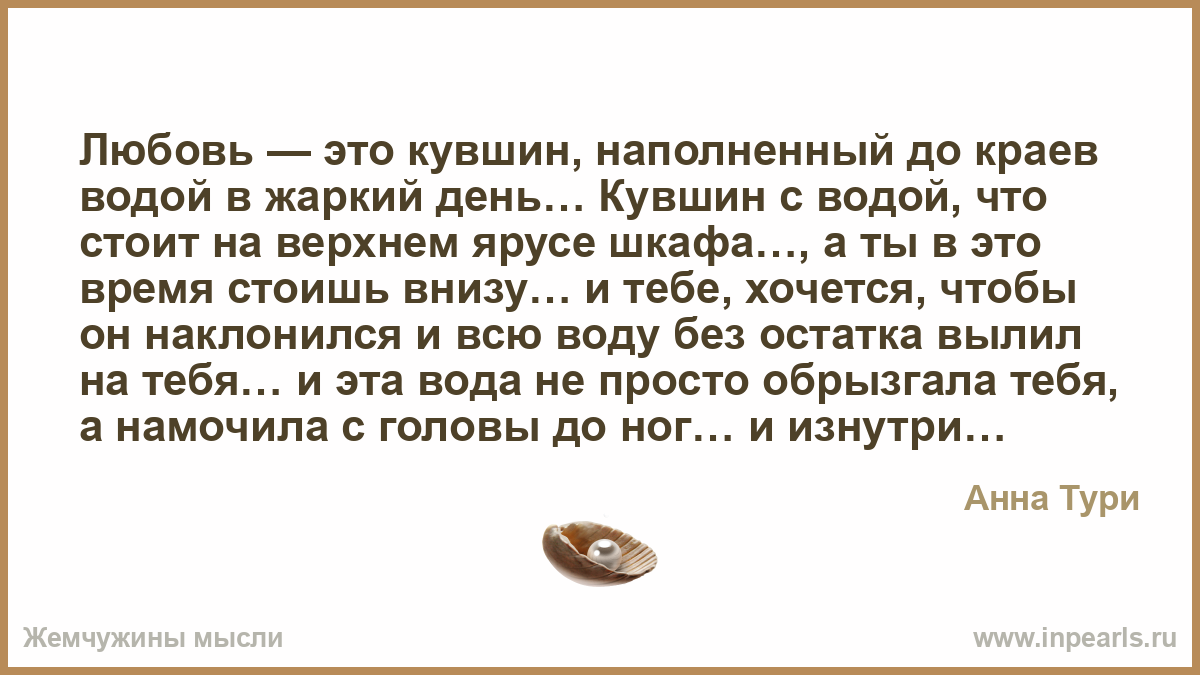 Любовь — это кувшин, наполненный до краев водой в жаркий день… Кувшин с водой, что стоит на верхнем ярусе шкафа…, а ты в это время стоишь внизу… и тебе, хочется, чтобы он наклонился и всю воду без остатка вылил на тебя… и эта вода не просто обрызгала тебя, а намочила с головы до ног… и изнутри,… да так, чтобы испытать все возможные с этим эмоции: неожиданность, необходимое утоление жажды, драйф, кайф, наслаждение… Но главное, чтобы оказаться под этим кувшином не одной…, а с тем, с кем бы хотелось бы прожить всю свою жизнь… И чтобы вода в том кувшине не заканчивалась… НИКОГДА!