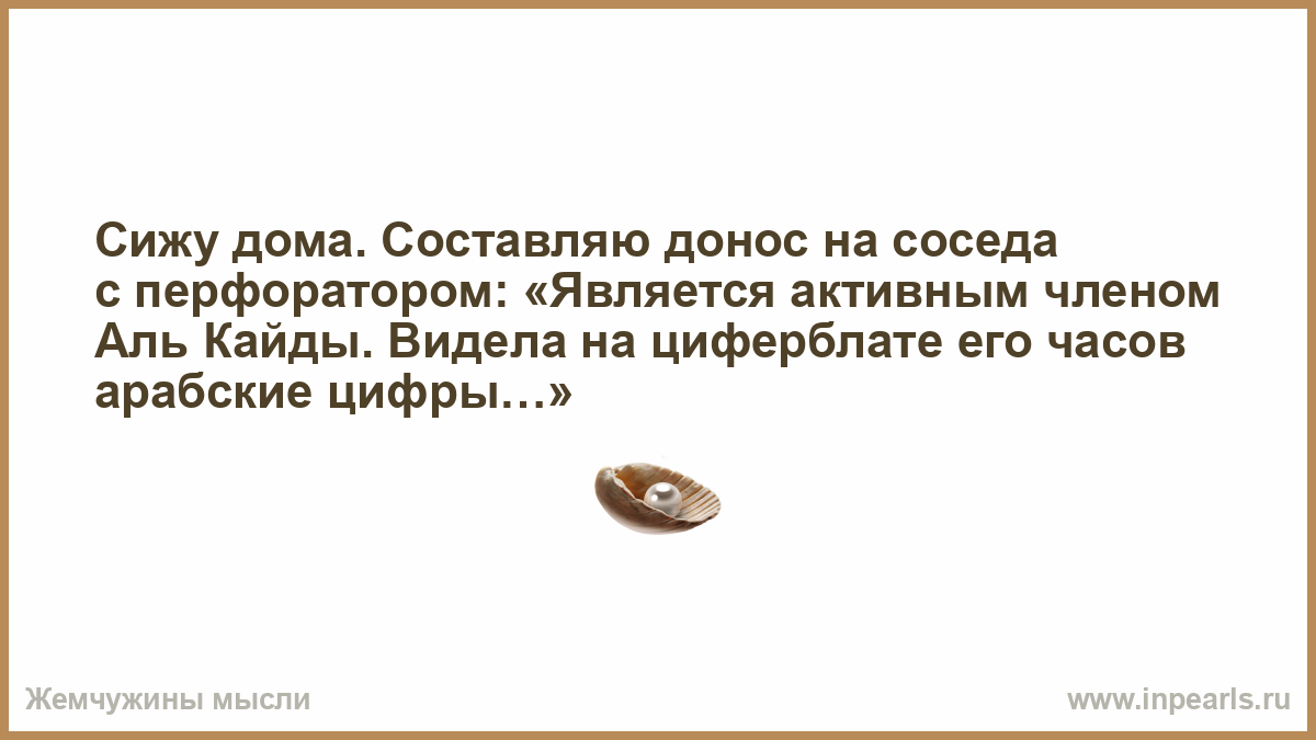 Сижу дома. Составляю донос на соседа с перфоратором: «Является активным членом Аль Кайды. Видела на циферблате его часов арабские цифры…»