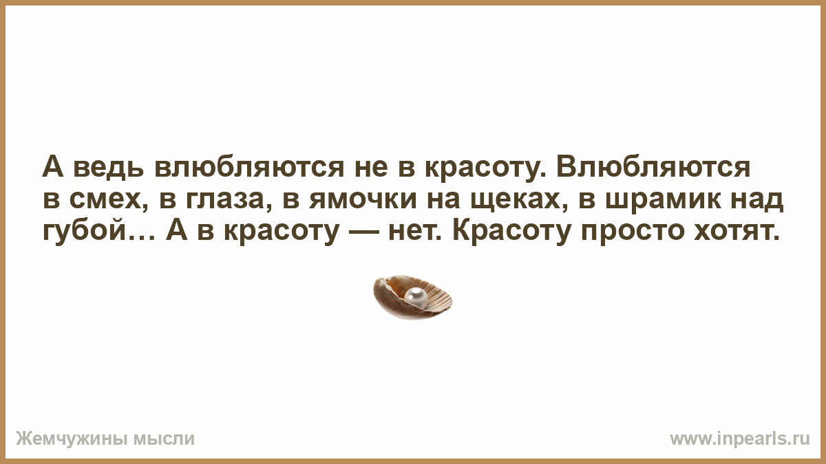 А ведь влюбляются не в красоту. Влюбляются в смех, в глаза, в ямочки на щеках, в шрамик над губой… А в красоту — нет. Красоту просто хотят.