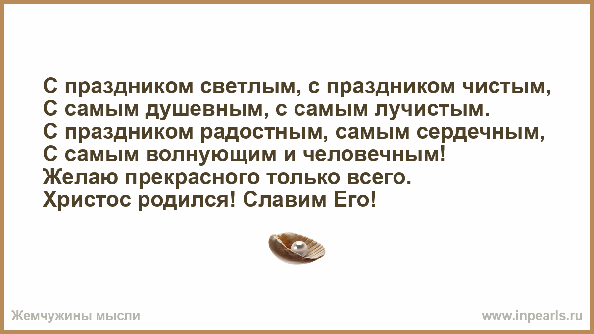 С праздником светлым, с праздником чистым, С самым душевным, с самым лучистым. С праздником радостным, самым сердечным, С самым волнующим и человечным! Желаю прекрасного только всего. Христос родился! Славим Его!