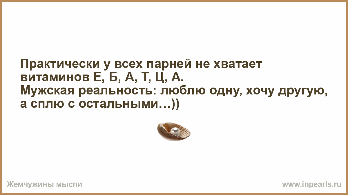 Практически у всех парней не хватает витаминов Е, Б, А, Т, Ц, А. Мужская реальность: люблю одну, хочу другую, а сплю с остальными…))