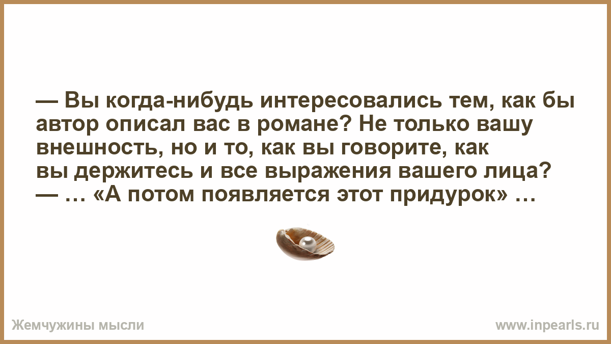 — Вы когда-нибудь интересовались тем, как бы автор описал вас в романе? Не только вашу внешность, но и то, как вы говорите, как вы держитесь и все выражения вашего лица?