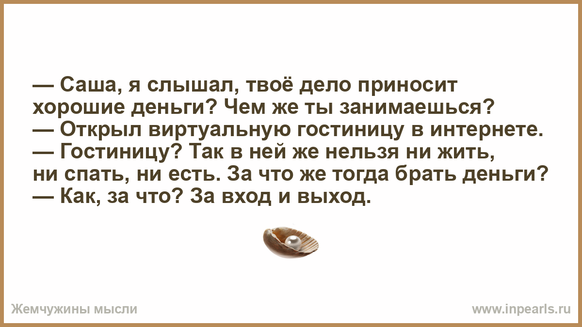 — Саша, я слышал, твоё дело пpиносит хоpошие деньги? Чем же ты занимаешься?