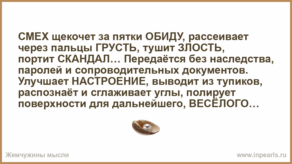 СМЕХ щекочет за пятки ОБИДУ, рассеивает через пальцы ГРУСТЬ, тушит ЗЛОСТЬ,