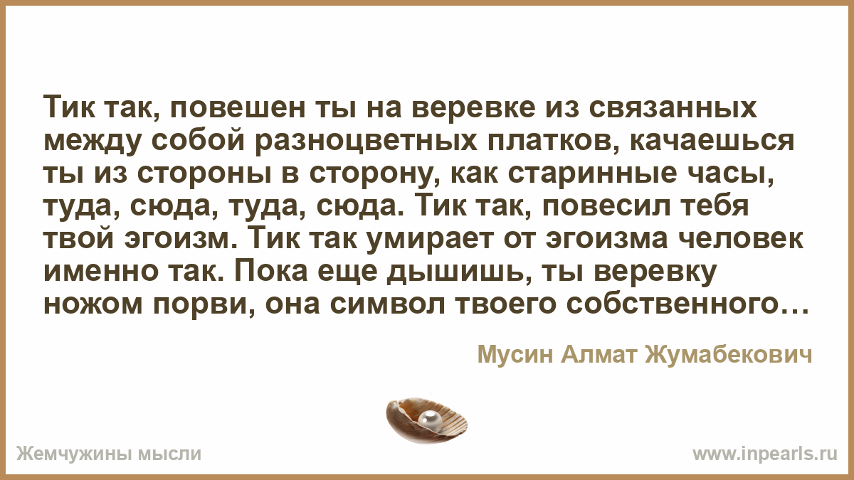 Тик так, повешен ты на веревке из связанных между собой разноцветных платков, качаешься ты из стороны в сторону, как старинные часы, туда, сюда, туда, сюда. Тик так, повесил тебя твой эгоизм. Тик так умирает от эгоизма человек именно так. Пока еще дышишь, ты веревку ножом порви, она символ твоего собственного эгоизма, порви, и как птица в небе пари, пари, пари.