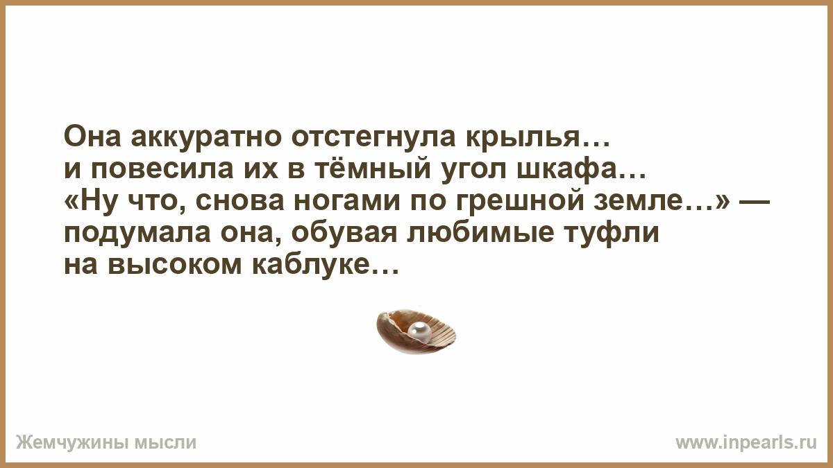 Она аккуратно отстегнула крылья… и повесила их в тёмный угол шкафа… «Ну что, снова ногами по грешной земле…» — подумала она, обувая любимые туфли на высоком каблуке…