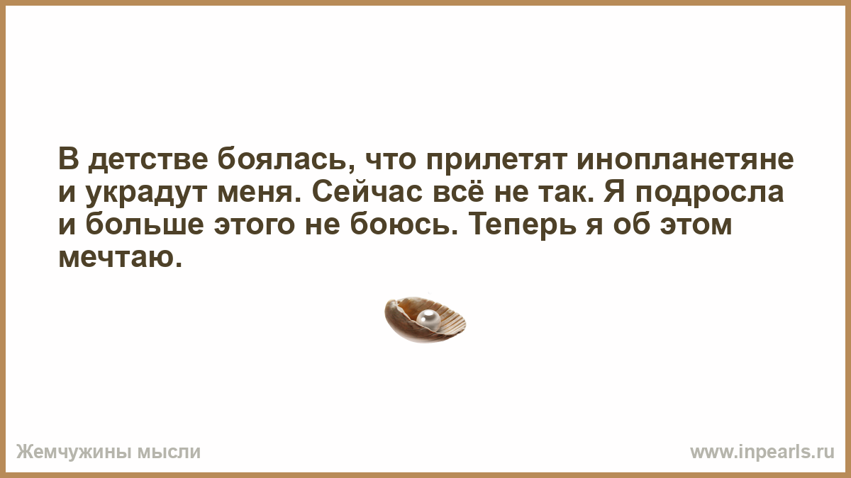 В детстве боялась, что прилетят инопланетяне и украдут меня. Сейчас всё не так. Я подросла и больше этого не боюсь. Теперь я об этом мечтаю.