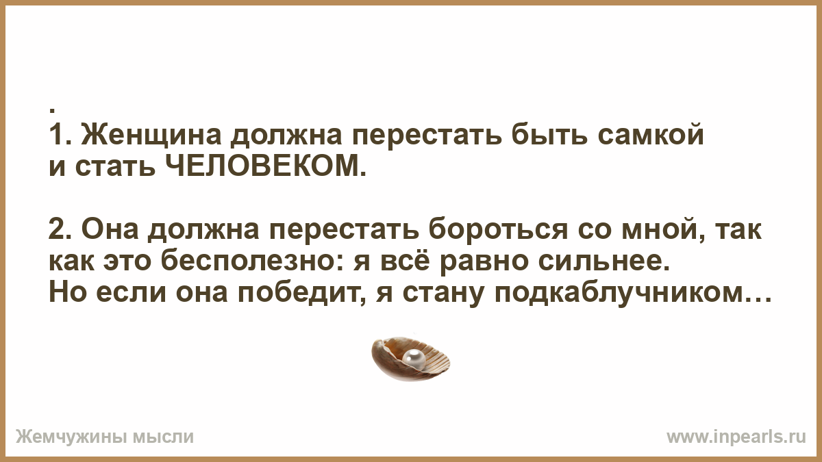 1. Женщина должна перестать быть самкой и стать ЧЕЛОВЕКОМ.