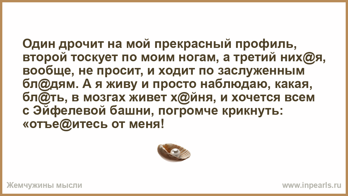 Один дрочит на мой прекрасный профиль, второй тоскует по моим ногам, а третий них@я, вообще, не просит, и ходит по заслуженным бл@дям. А я живу и просто наблюдаю, какая, бл@ть, в мозгах живет х@йня, и хочется всем с Эйфелевой башни, погромче крикнуть: «отъе@итесь от меня!