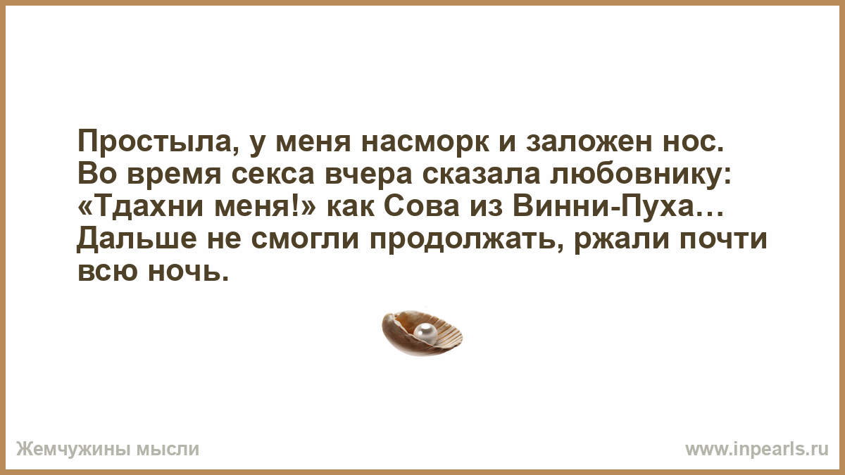 Простыла, у меня насморк и заложен нос. Во время секса вчера сказала любовнику: «Тдахни меня!» как Сова из Винни-Пуха… Дальше не смогли продолжать, ржали почти всю ночь.