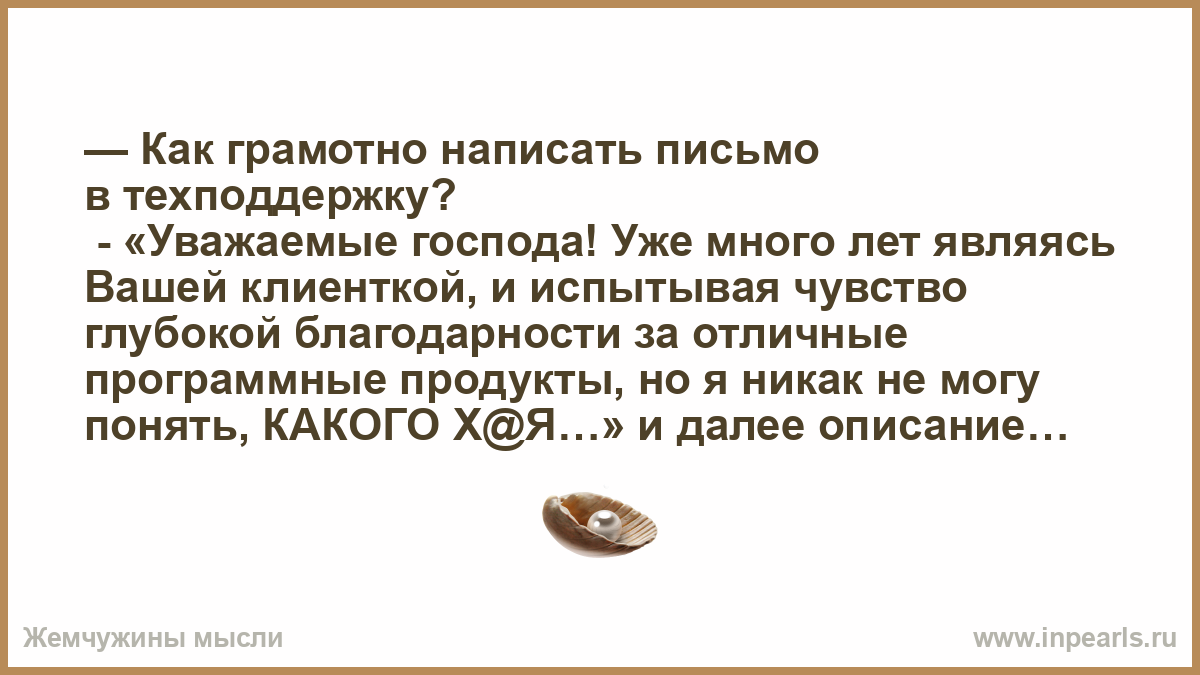 — Как грамотно написать письмо в техподдержку? - «Уважаемые господа! Уже много лет являясь Вашей клиенткой, и испытывая чувство глубокой благодарности за отличные программные продукты, но я никак не могу понять, КАКОГО Х@Я…» и далее описание проблемы.
