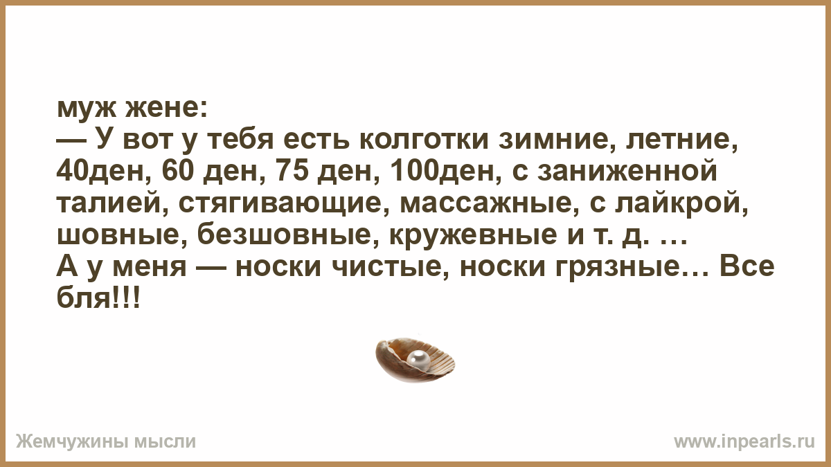 — У вот у тебя есть колготки зимние, летние, 40ден, 60 ден, 75 ден, 100ден, с заниженной талией, стягивающие, массажные, с лайкрой, шовные, безшовные, кружевные и т. д. … А у меня — носки чистые, носки грязные… Все бля!!!