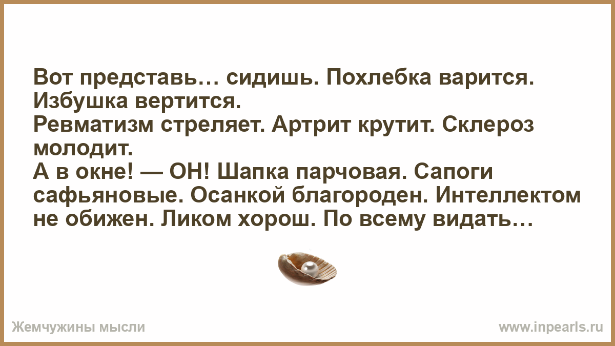 Вот представь… сидишь. Похлебка варится. Избушка вертится. Ревматизм стреляет. Артрит крутит. Склероз молодит. А в окне! — ОН! Шапка парчовая. Сапоги сафьяновые. Осанкой благороден. Интеллектом не обижен. Ликом хорош. По всему видать, за счастьем своим.)