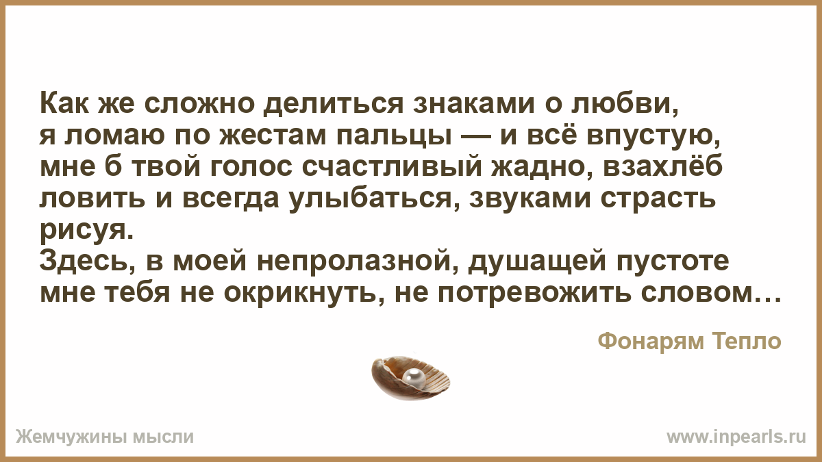 Как же сложно делиться знаками о любви, я ломаю по жестам пальцы — и всё впустую, мне б твой голос счастливый жадно, взахлёб ловить и всегда улыбаться, звуками страсть рисуя.