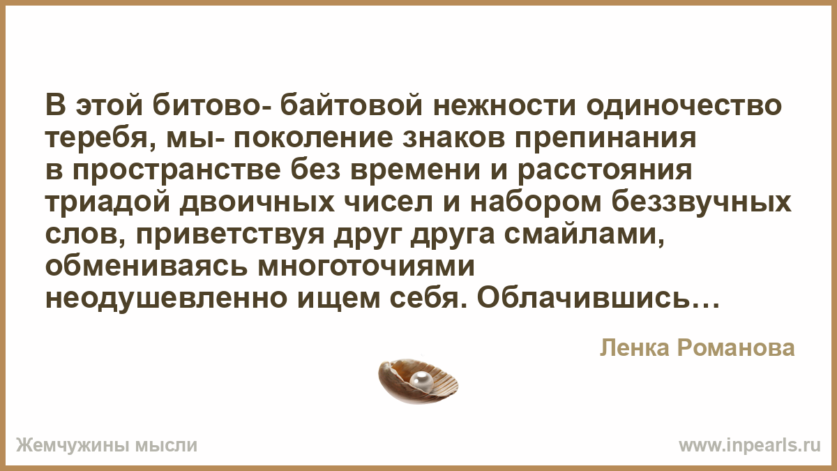 В этой битово- байтовой нежности одиночество теребя, мы- поколение знаков препинания в пространстве без времени и расстояния триадой двоичных чисел и набором беззвучных слов, приветствуя друг друга смайлами, обмениваясь многоточиями