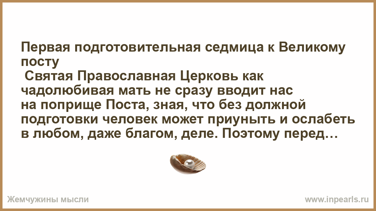 Чтобы посрамить гордыню фарисея, который придавал значение своему посту, Церковь отменяет пост в среду и пятницу (поэтому она называется «сплошной седмицей»), показывая, что не пост или какое-либо другое дело спасает человека, а Бог, ищущий смиренное сердце. Так постепенно ужесточается воздержание: после сплошной седмицы восстанавливаются посты среды и пятницы; затем следует высшая степень приготовления — запрещение вкушать мясную пищу.