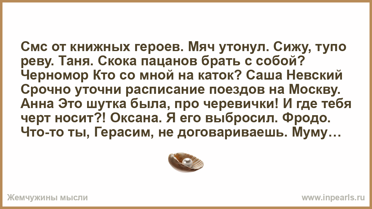 Смс от книжных героев. Мяч утонул. Сижу, тупо реву. Таня. Скока пацанов брать с собой? Черномор Кто со мной на каток? Саша Невский Срочно уточни расписание поездов на Москву. Анна Это шутка была, про черевички! И где тебя черт носит?! Оксана. Я его выбросил. Фродо. Что-то ты, Герасим, не договариваешь. Муму. Желаю счастья, вы прекрасная пара, в постели Мальвина бревно бревном. Пьеро. Платок и бусы купил. Ищу цветочек. Папа. Буду поздно, не забудь помолиться на ночь. Отелло.)))))))))))))))))))))))))) Чеширский кот. В ж*пу кроликов, грибы и гусениц! больше после обеда не сплю. Алиса. Дедушка, адрес скажи! From: Ваня Под ноги надо было смотреть, уроды. Аннушка. Куплю стулья. Остап. Твой хвост у Совы. Пух Мелофон у меня. Я дома. Алиса Молилась. Жду. Дездемона. Володя, во сколько стрелка? Место помню. Глеб. Ты здесь? Я на третьем, давай пересечемся. Данте. Мой тебе совет-смени кодировку, сойдется. Герда Твоя благоверная шизанулась, с зеркалом общается. Прячусь у кентов. Белоснежка Друган, давай в пятницу сходим в кабак, выпьем? Я угощаю. Сальери Папа, я все сдал! Павлик Половина двенадцатого! Герман, ты где? Пишу с английского номера. Подвески забрал, скоро буду. Д? Арт Дождись своего трамвая. Берлиоз. Дождусь. Макс Фрай. Пушкин, ты сам-то когда-нить изумруды грыз? Белочка Земля. Санников Я быстро — одна нога здесь, другая там! А. Каренина Блин, когда же я высплюсь? Красавица. ДА! И я! Брут. Они все больные! Айболит, А у Диснея я бы выжила, слышишь, Ганс! Русалочка Сны пронумеровала. Что дальше делать? Вера Павловна Вскрытие показало, что пациент переедал. Лесорубы Олег, смотри под ноги! Конь Достопочтимый сэр! Обстоятельства задерживают, нагоню на болотах. Ваша Собака. anekdotov.net