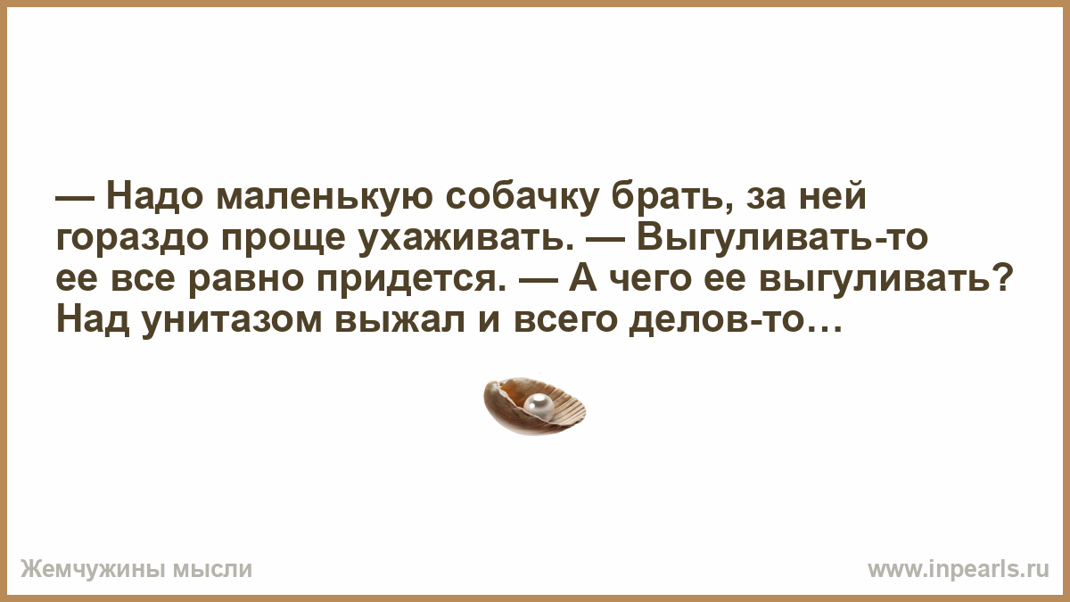 — Надо маленькую собачку брать, за ней гораздо проще ухаживать. — Выгуливать-то ее все равно придется. — А чего ее выгуливать? Над унитазом выжал и всего делов-то…