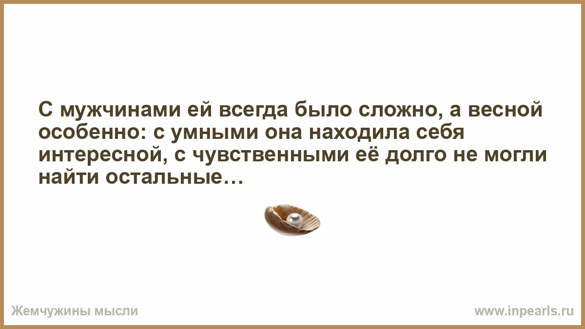С мужчинами ей всегда было сложно, а весной особенно: с умными она находила себя интересной, с чувственными её долго не могли найти остальные…