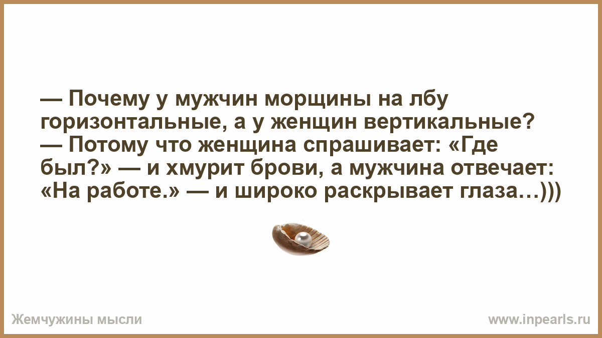 — Почему у мужчин морщины на лбу горизонтальные, а у женщин вертикальные? — Потому что женщина спрашивает: «Где был?» — и хмурит брови, а мужчина отвечает: «На работе.» — и широко раскрывает глаза…)))