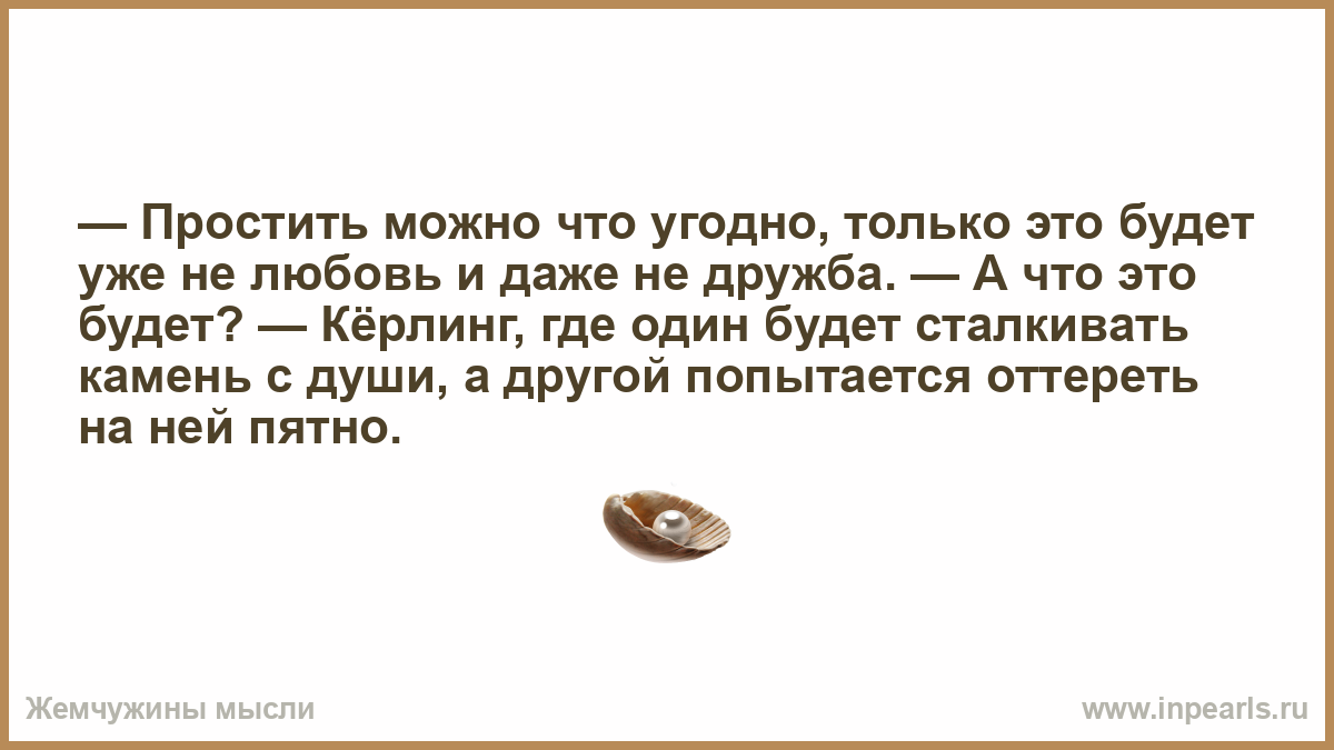— Простить можно что угодно, только это будет уже не любовь и даже не дружба. — А что это будет? — Кёрлинг, где один будет сталкивать камень с души, а другой попытается оттереть на ней пятно.