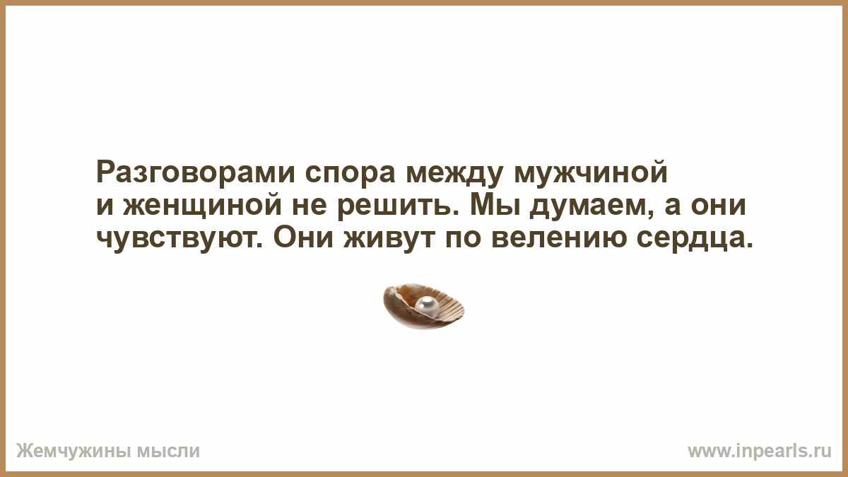 Разговорами спора между мужчиной и женщиной не решить. Мы думаем, а они чувствуют. Они живут по велению сердца.