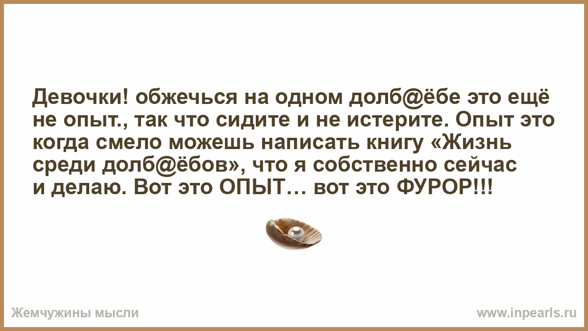Девочки! обжечься на одном долб@ёбе это ещё не опыт., так что сидите и не истерите. Опыт это когда смело можешь написать книгу «Жизнь среди долб@ёбов», что я собственно сейчас и делаю. Вот это ОПЫТ… вот это ФУРОР!!!